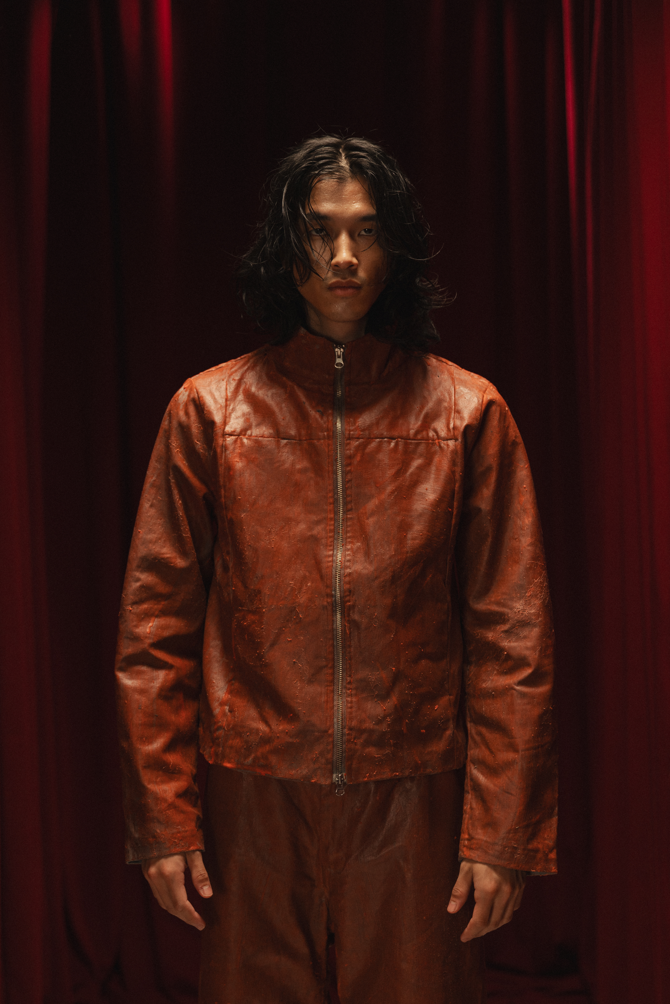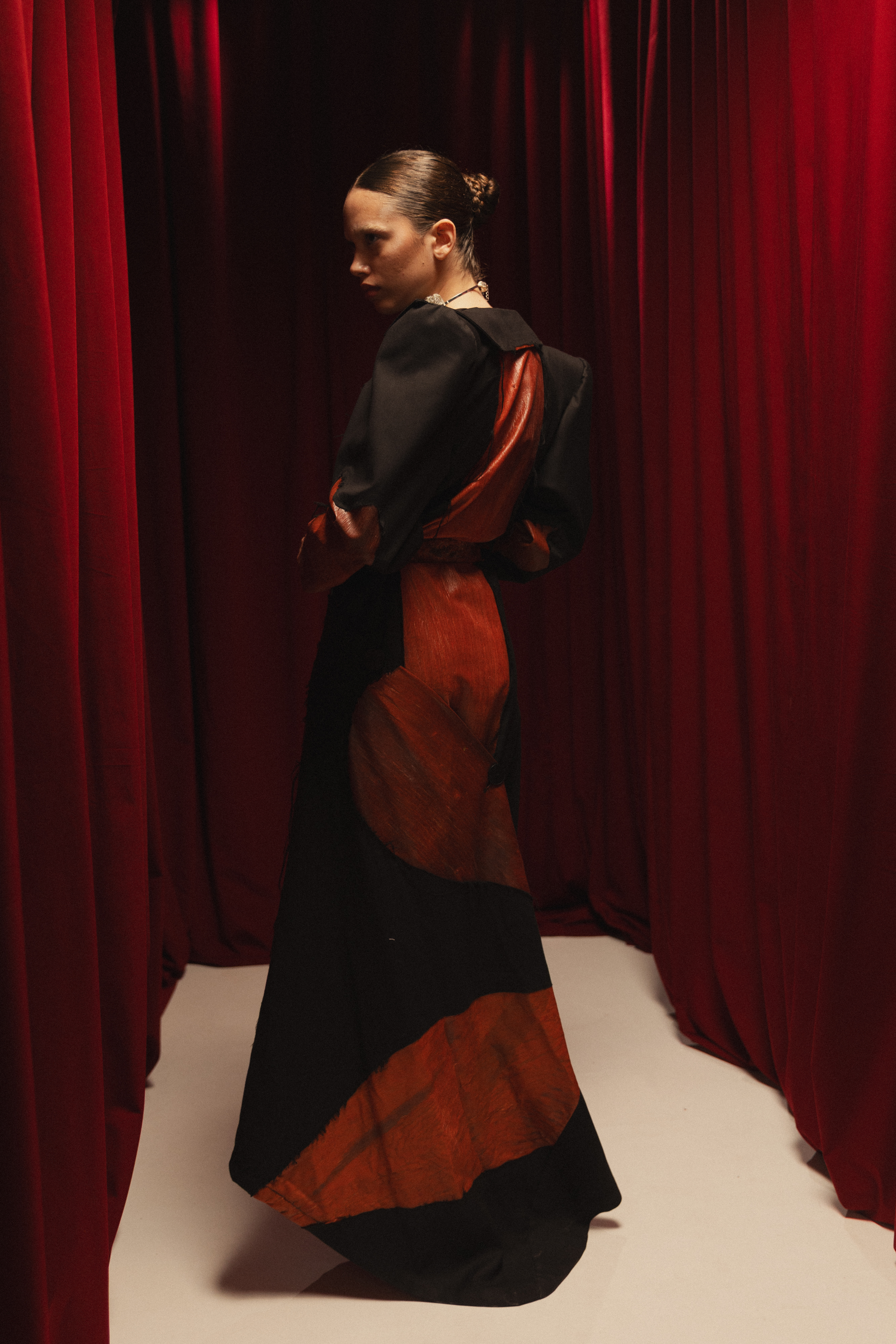 La propuesta es una disección estética del brutalismo: siluetas de impacto estructural, desarrollo de látex orgánico y manipulación técnica de fibras naturales.